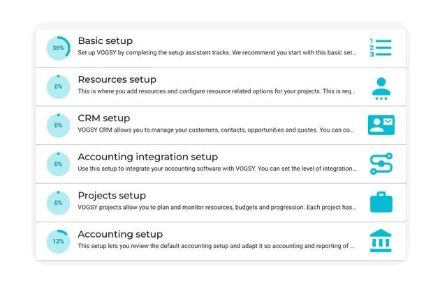Daarna kan je VOGSY met de on-board 'set-up assistant' inrichten zodat VOGSY past bij jullie manier van werken, je klanten, projecten en boekhoudpakket.